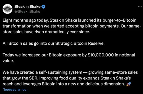 Американська мережа ресторанів швидкого харчування з 91-річною історією Steak'n Shake оголосила про створення біткоін-резерву. Компанія повідомила про покупку першої криптовалюти на $10 млн.