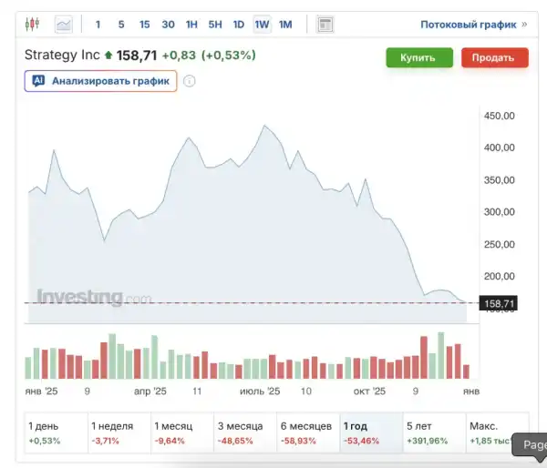 У грудні 2025 року акції Strategy досягли річного мінімуму $155. 26 грудня папери компанії торгувалися на рівні $158–159. Падіння протягом року становило понад 53%.