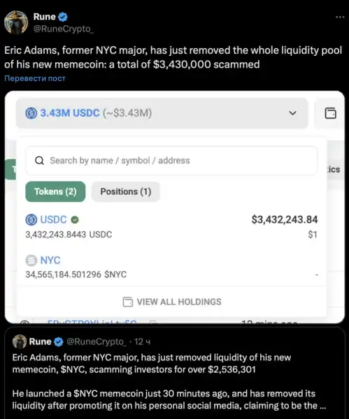 Проте запуск мемкоіна виявився провальним. Токен на блокчейні Solana за 30 хвилин після релізу знизився в ціні з $0,47 до $0,1. Ринкова капіталізація скоротилася з $580 млн до $110 млн, демонструють дані DEXScreener. За інформацією криптоаналітика під псевдонімом Рун (Rune), інвестори втратили на NYC Token понад $3,4 млн.