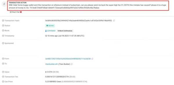 • Згідно з даними мережі, помилкова транзакція призвела до непомірної комісії за пальне у розмірі понад 31 ETH, що наразі перевищує 50 000 доларів. У публічному повідомленні «Транзакція» відправник благає одержувача, titanbuilder.eth, повернути суму. Користувач стверджує, що «гаманець з помилками» помилково виконав транзакцію на Ethereum замість PulseChain.
