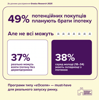 Щоправда, далеко не всім бажаючим вдається отримати іпотеку: на складнощі з цим скаржаться 23%.Особливо багато труднощів відчувають саме молоді люди: попри значну переорієнтацію на них тієї ж державної програми єОселя, молодь 18−34 років поки не може взяти банківський кредит у 38% випадків.